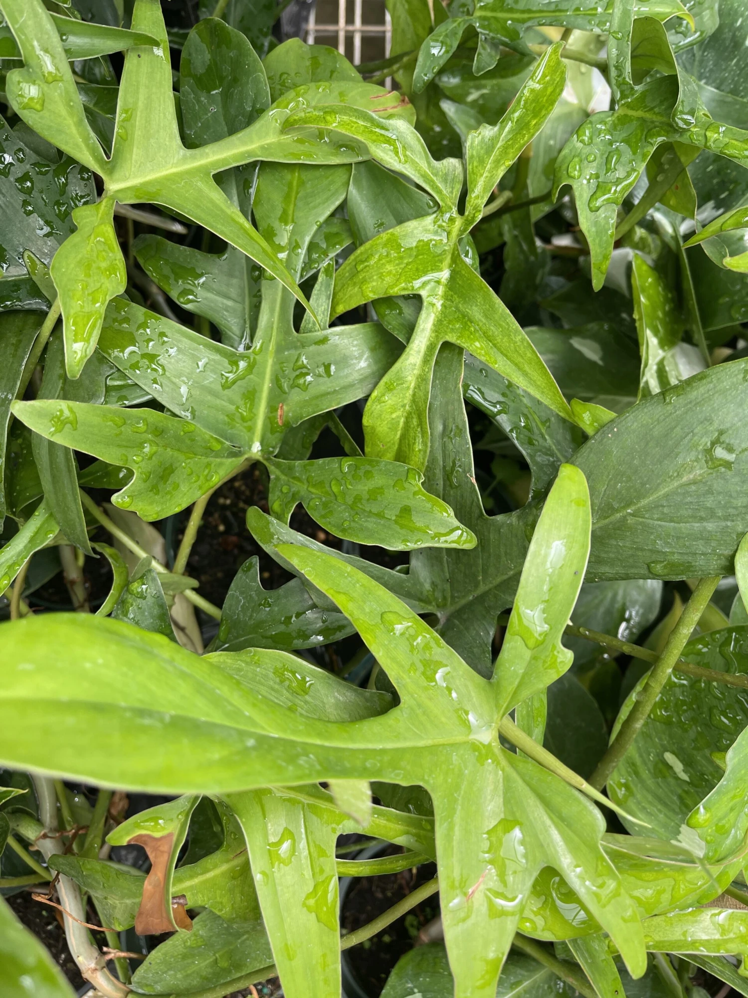 Philodendron โGlad Handsโ is a mutation of pedatum with thinner mid ribs on leaves that resemble hands! Its features include large, oak-leaf-shaped foliage with beautiful red stems. This easy-care vining Philodendron will tolerate a variety of lighting conditions and should only be watered when the soil is dry. Bright indirect sunlight.