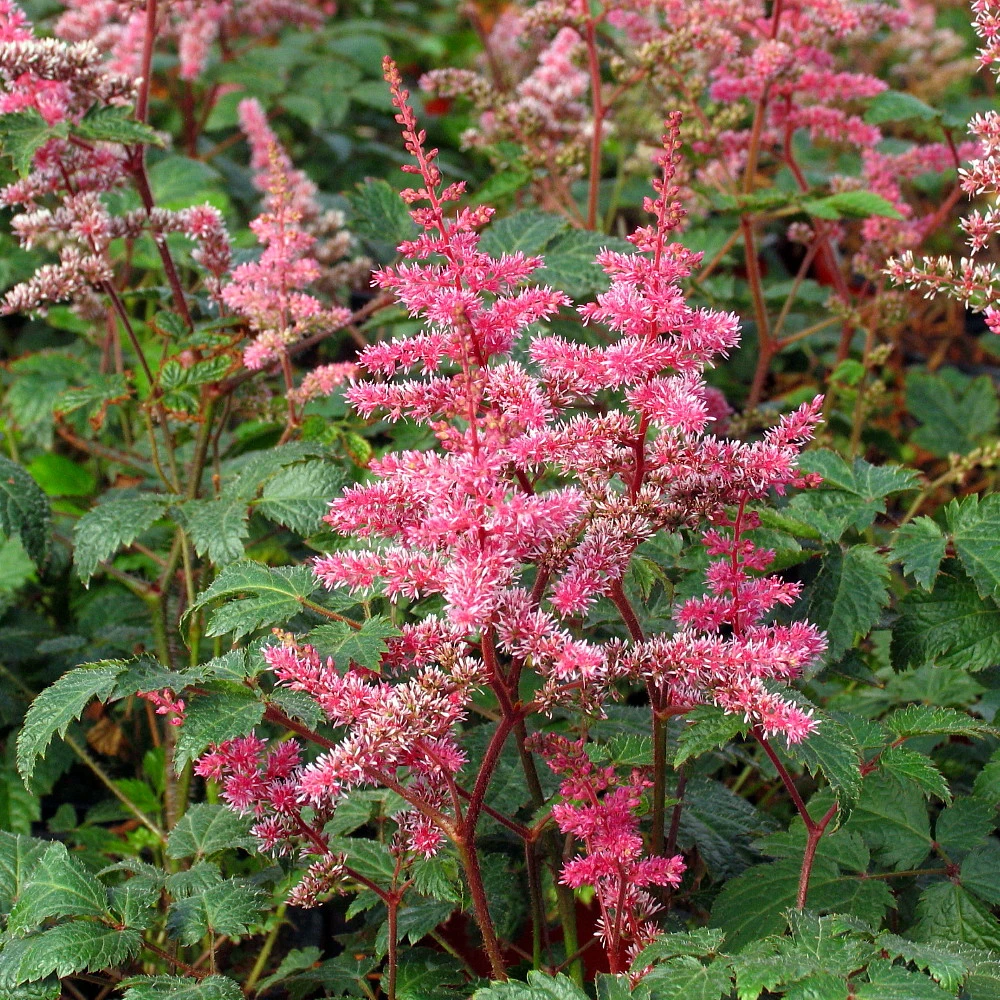 Bright raspberry pink, slightly fragrant plumes on red stems. A longer blooming Astilbe, blooms mid to late summer. Clumps of very attractive, finely divided foliage. Requires moist rich soil. Adaptable to the seashore. Part shade. Spacing: 12″.