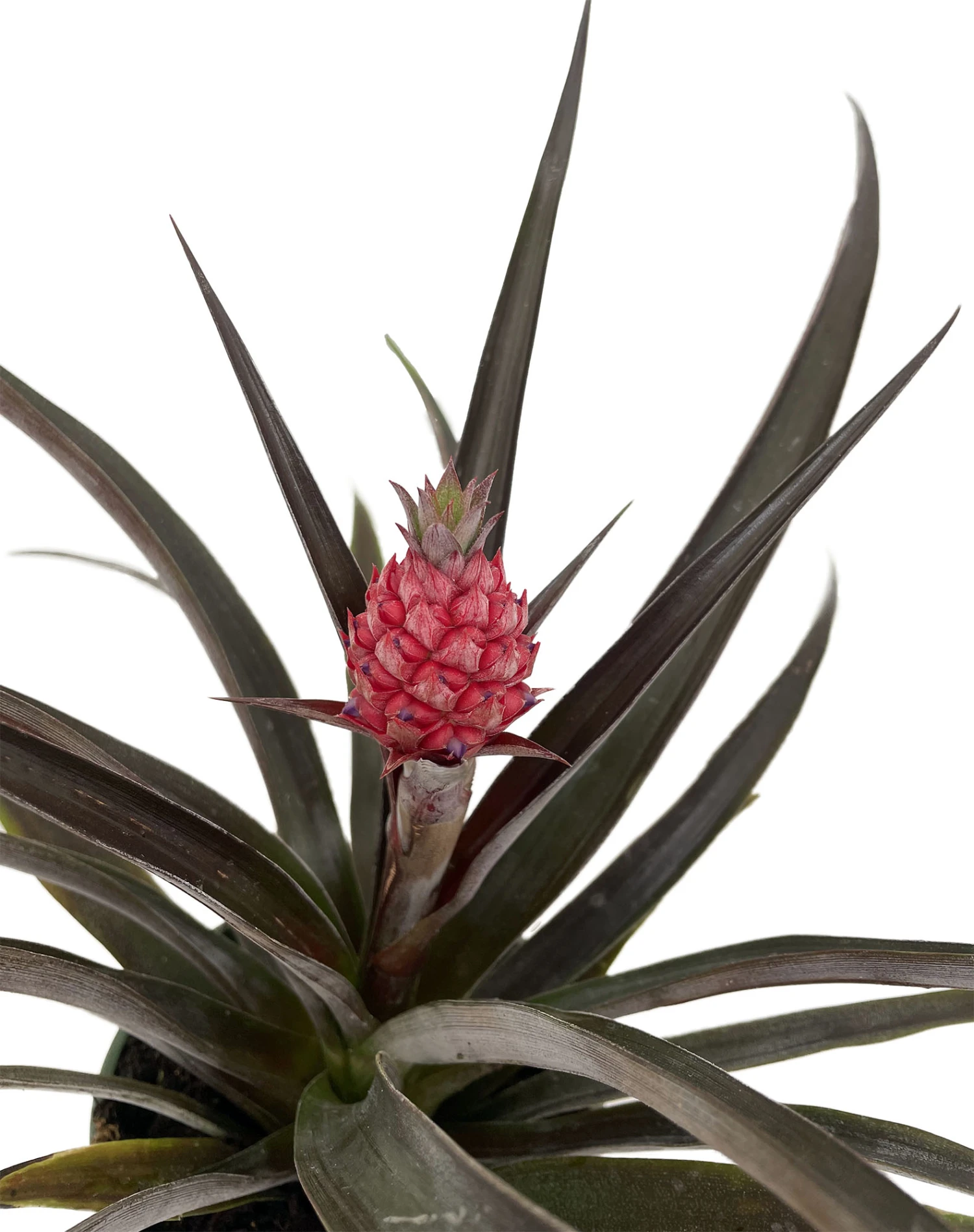 Red pineapples are generally smaller than common commercial pineapples and grow on a thick stem that is nestled among curved, elongated, and pointed leaves. The oblong to cylindrical fruit has a waxy, fibrous skin that is covered in downward-facing, red-pink spines, and the fruit connects to a leafy and spiked, variegated green-red crown. Underneath the tough skin, the flesh contains hues of white, yellow, and pink, and is dense and somewhat chewy, encasing a hard, central core. Depending on the climate the fruit is grown in, the flesh can be juicy with a sweet and slightly tangy taste and may or may not contain seeds. Though the plants are mainly considered to be ornamental, in tropical climates with a high amount of rainfall, Red pineapples are edible and are consumed fresh or juiced. Red pineapples are edible but will vary in texture and flavor depending on the climate and amount of water the plant has received during the growing process. The fruit will keep up to five days when stored whole and upside-down to allow sugars to redistribute from base to crown in the refrigerator. Sliced pieces of fruit will keep 1-3 days when stored in a sealed container in the refrigerator. Today Red pineapples are not commercially grown on a large scale and are predominately found as a specialty, ornamental variety in home gardens.