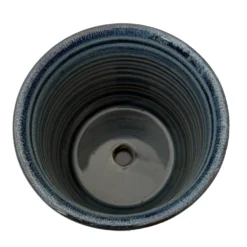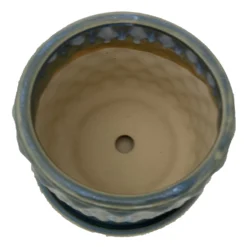 Rustic engraved design with an attached saucer, one drainage hole. Natural variations in the glaze will occur.
